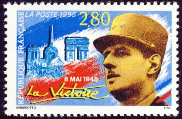 2 f. 80 bleu, brun-jaune, jaune et rouge - 8 mai 1945, la Victoire. Portrait du Général de Gaulle et monuments de Paris - 1995