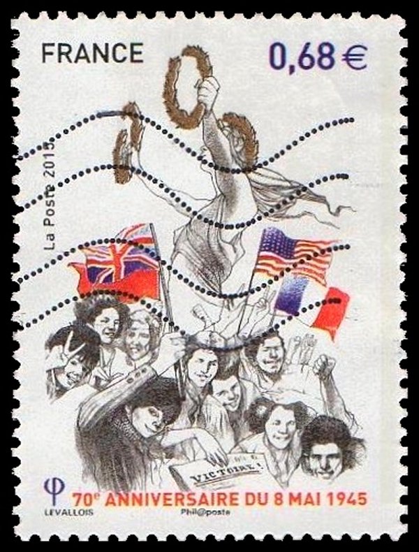 0,68€ polychrome - 70ème anniversaire du 8 mai 1945. Représentation de la Victoire tenant 2 couronnes de laurier. 1 bande de phosphore à droite. - 2015