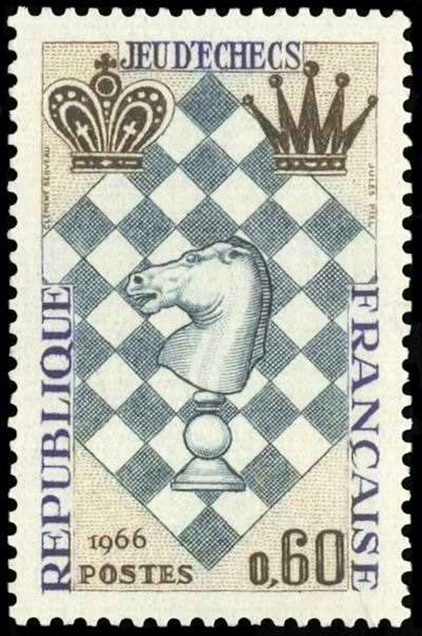 Le jeu d'échecs, sans doute créé, dans sa version d'origine, du côté du Cachemire, a toujours suscité la curiosité et l'admiration. Comment ce jeu aux règles potentiellement "simples" a pu déclencher et déclencher encore tant de passions ? Sans doute pour son caractère universel et sa capacité à s'adapter à toutes les civilisations. Pour honorer ce jeu et les événements liés, la France a émis modestement (par rapport à d'autres pays) plusieurs timbres. D'abord en 1966 (ci-dessus) avec le timbre 60 c. outremer, gris-bleu et ocre, libellé "Festival international des échecs du Havre"puis en 1974, le 1 f. brun, outremer ...