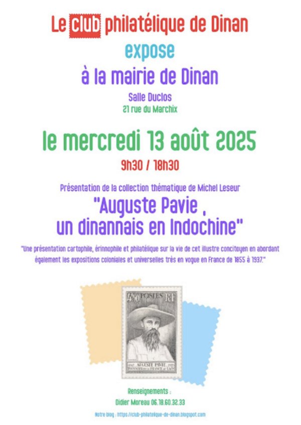 Amis philatélistes, ne manquez pas cette superbe exposition sur "Auguste Pavie en Indochine", réalisée par Michel Leseur à la mairie de Dinan (salle Duclos), le mercredi 13 Août de 9h30 à 18h30....